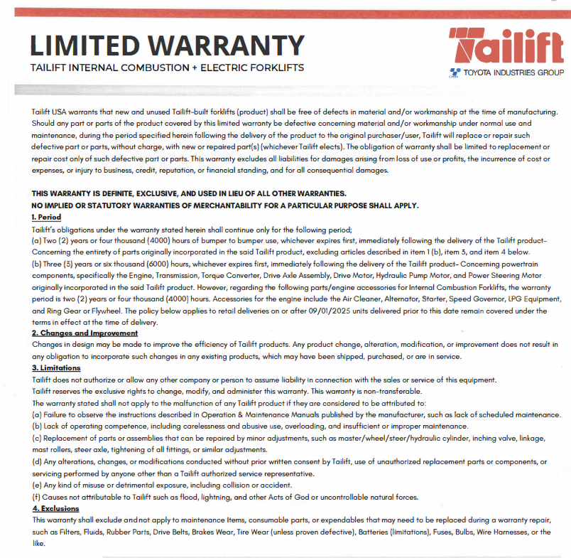 Additionally, all LPG, diesel, and electric sit-down forklifts we sell include a warranty for your peace of mind. Learn about our Tailift Warranty here. Contact us today to explore our forklift options and find the perfect match for your operational needs.